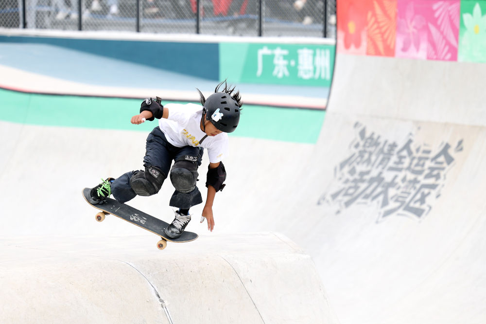 2025年11月11日,廣東隊(duì)選手鄒明珂在廣東惠州舉行的第十五屆全國(guó)運(yùn)動(dòng)會(huì)滑板項(xiàng)目女子碗池賽決賽中。新華社記者盧漢欣攝