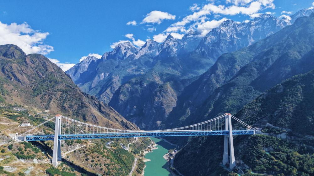 這是11月21日拍攝的虎跳峽金沙江鐵路大橋。大橋全長882.5米,起于玉龍雪山隧道出口,止于哈巴雪山隧道進口,是麗香鐵路的重點控制性工程(無人機照片)。
