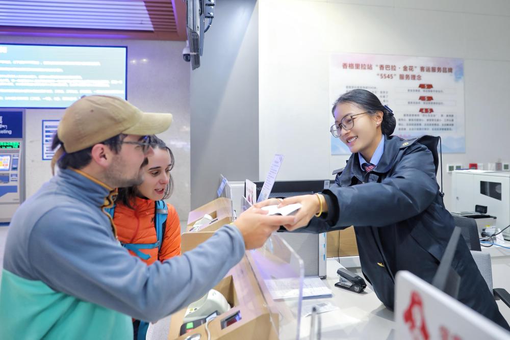 11月18日,外籍旅客在云南香格里拉站“香巴拉·金花”服務(wù)臺購票。車站為旅客提供“一站式”出行服務(wù)。