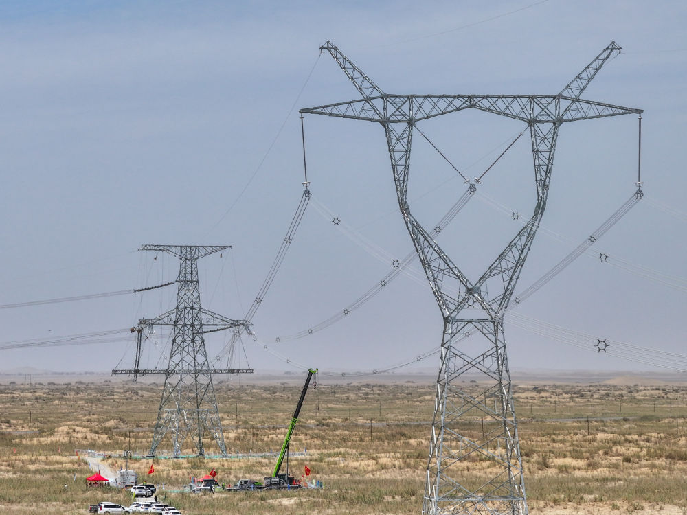 2025年7月13日,在塔里木盆地南緣的新疆和田地區(qū)民豐縣,隨著牽引機(jī)將最后一段電線成功從183號鐵塔拽至188號鐵塔,歷時15年建設(shè)的環(huán)塔里木盆地750千伏輸變電工程全線貫通(無人機(jī)照片)。新華社記者 丁磊 攝