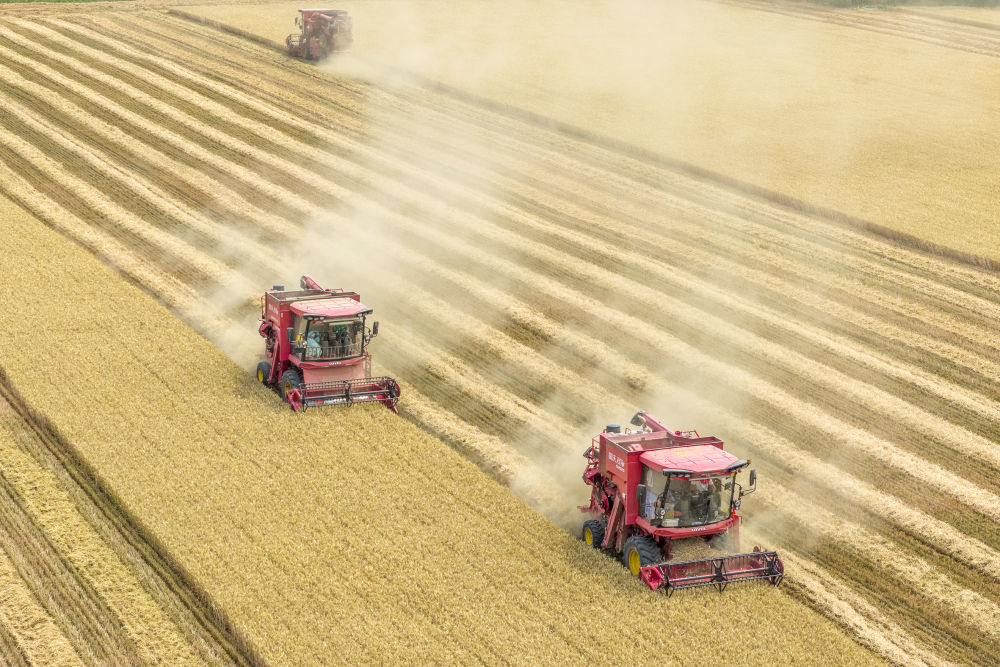 2025年6月9日,河南省三門峽靈寶市西閻鄉(xiāng)東古驛村村民在搶收小麥(無人機(jī)照片)。新華社發(fā)(杜杰 攝)