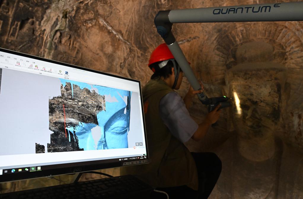 2025年4月9日,武漢大學文化遺產(chǎn)智能計算實驗室團隊成員在魏字洞使用關節(jié)臂掃描儀對佛像進行數(shù)字化掃描。新華社記者 李嘉南 攝