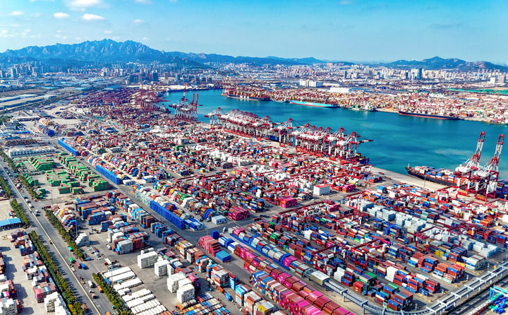 貨輪在青島自貿(mào)片區(qū)裝卸貨物(2025年11月5日攝,無人機(jī)照片)。新華社發(fā)(張進(jìn)剛攝)