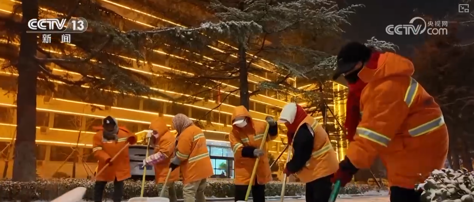 降雪后,當(dāng)?shù)丨h(huán)衛(wèi)部門組織人員連夜上崗,清掃路面積雪。