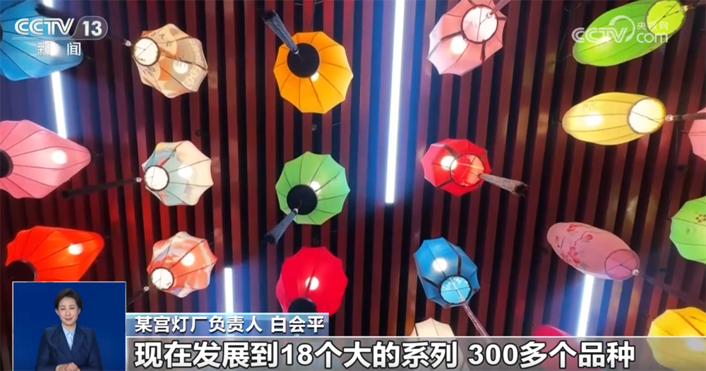 某宮燈廠負(fù)責(zé)人 白會(huì)平:通過(guò)跟大專院校合作,研發(fā)新的產(chǎn)品,每年都得有一個(gè)新的突破。現(xiàn)在我們國(guó)潮風(fēng)的燈籠特別受年輕消費(fèi)群體的喜歡。原來(lái)我們是單一的幾個(gè)品種,現(xiàn)在發(fā)展到18個(gè)大的系列、300多個(gè)品種,而且根據(jù)客戶的要求還可以量身定做。