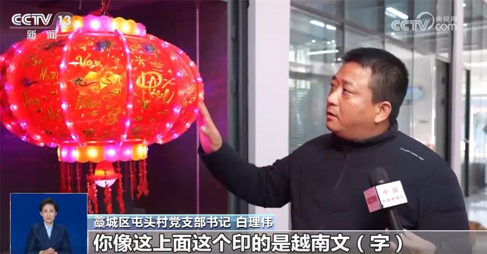 藁城區(qū)屯頭村黨支部書(shū)記 白理偉:通過(guò)宮燈博覽會(huì),對(duì)接了市場(chǎng)、增加了客戶,你像這個(gè)上面印的是越南文字,一些吉祥話,這是近兩年新開(kāi)發(fā)的產(chǎn)品。