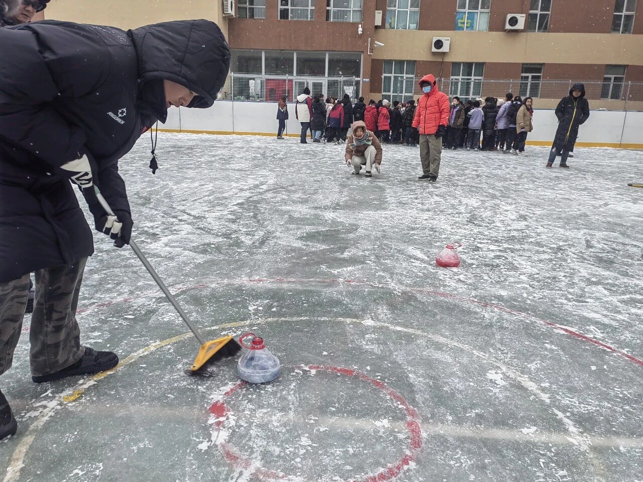 克拉瑪依市第五小學師生自制“冰壺”,在校園進行比賽??死斠朗械谖逍W 供圖