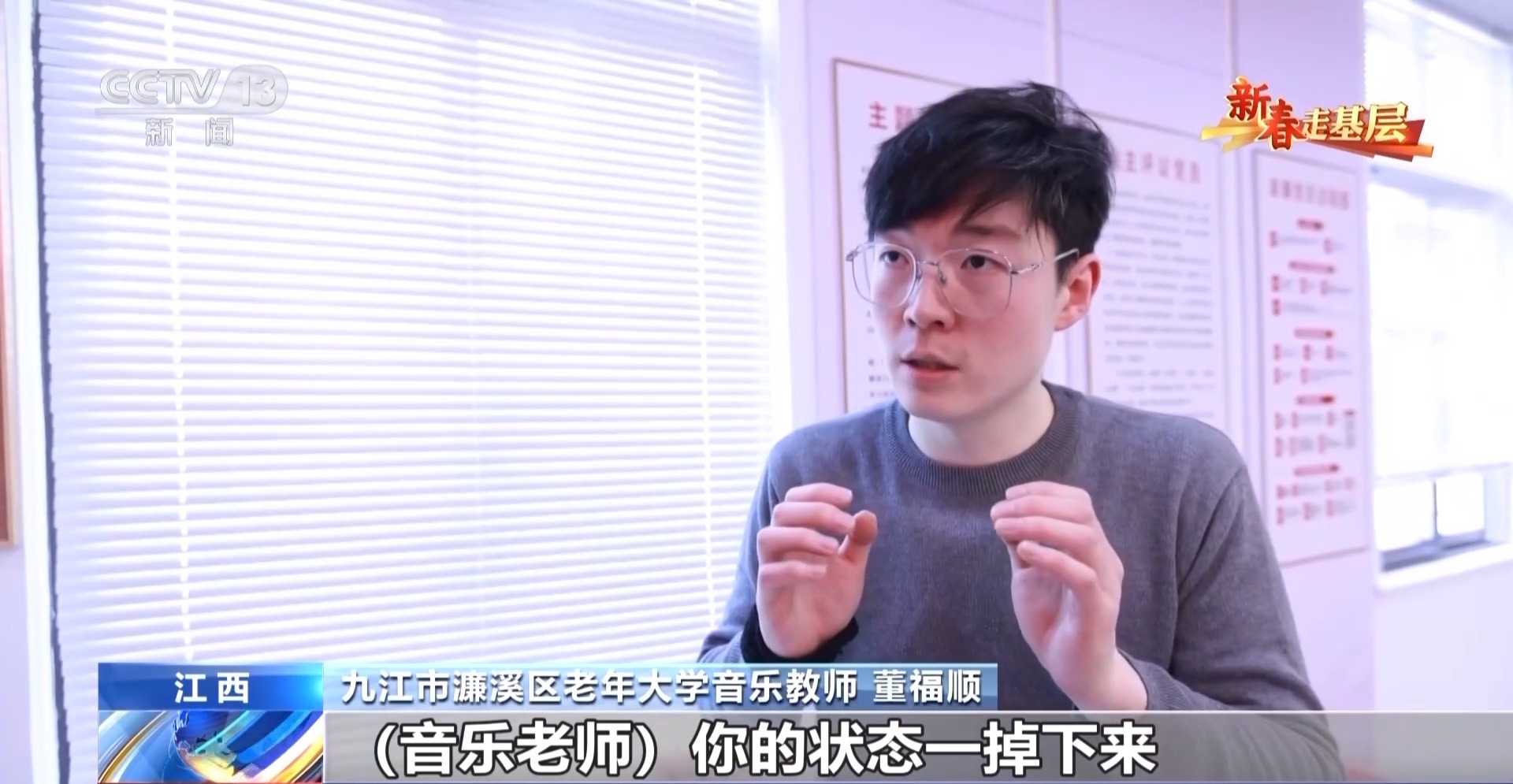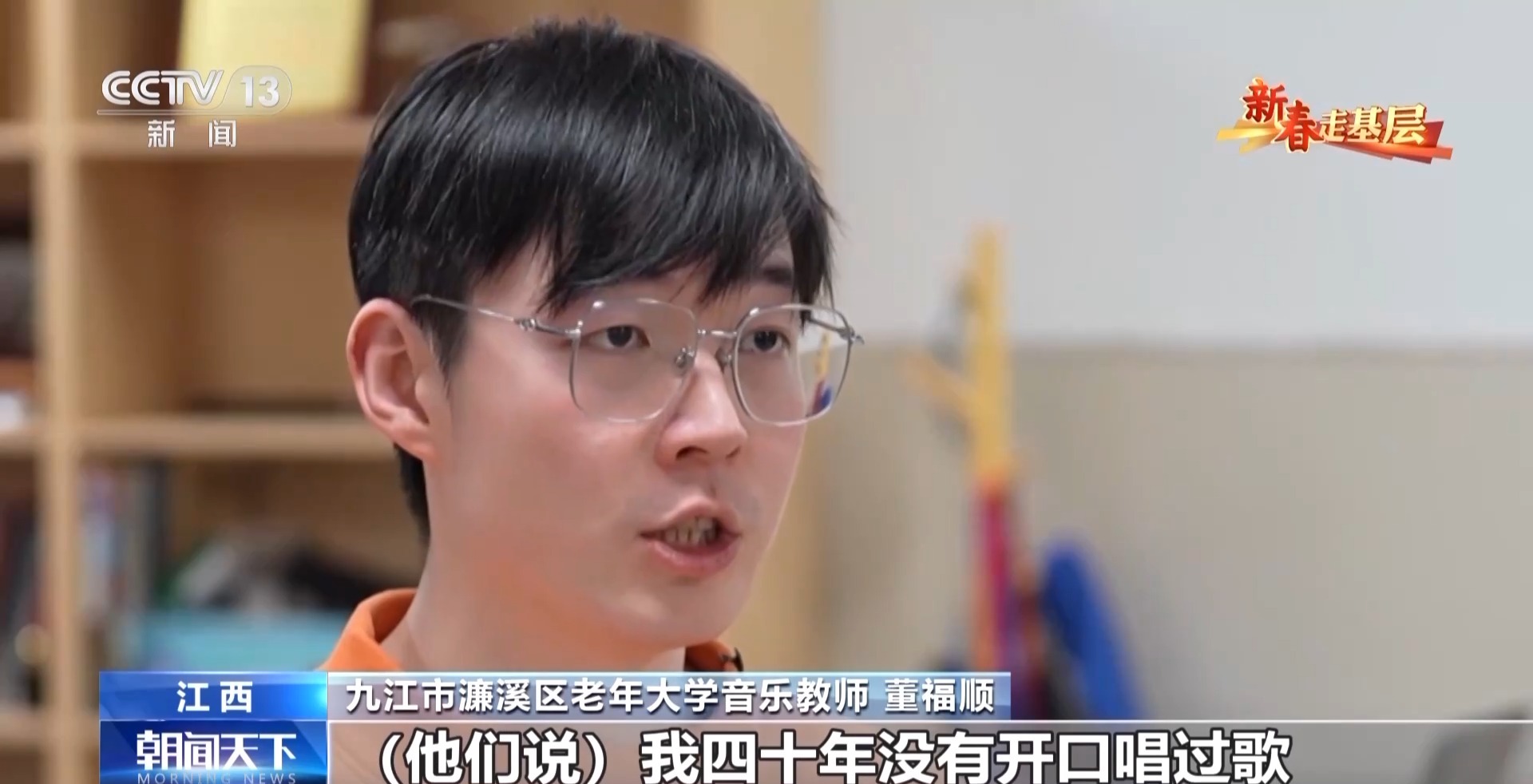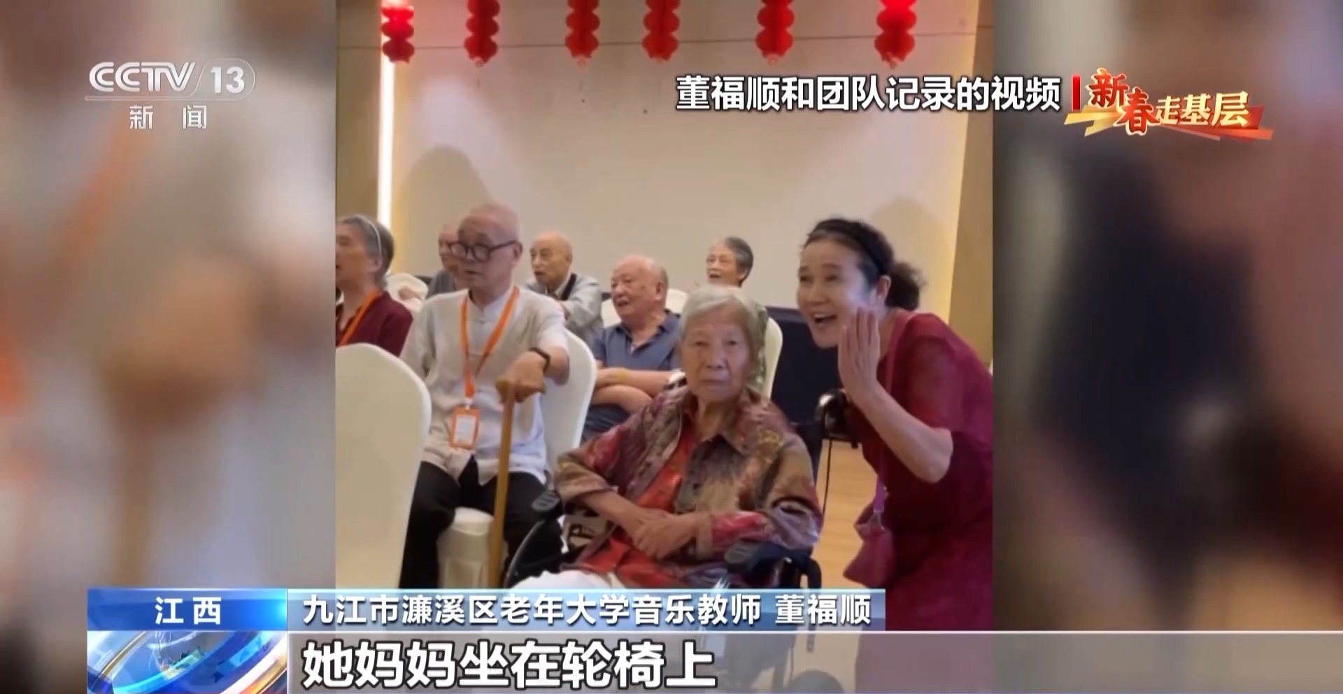 九江市濂溪區(qū)老年大學(xué)音樂教師 董福順:我去了之后,他們說我四十年沒有開口唱過歌,已經(jīng)很久很久,他們說都快忘了這首歌的歌詞了,你過來了,讓我想起了它。所以我覺得我又一次被認(rèn)可了,我也覺得是他們在給我一點能量,當(dāng)看著他們唱回憶起的這些歌曲的時候,他們坐直了,開始朝我揮手去唱,我覺得這件事做對了。