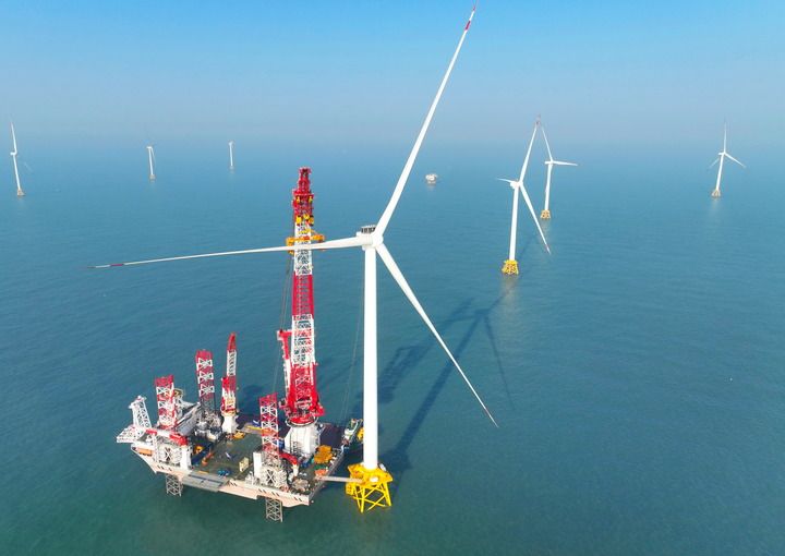 2026年1月13日在福建閩南海域拍攝的“大橋海風(fēng)”號2000噸自升式海上風(fēng)電安裝平臺和20兆瓦風(fēng)電機(jī)組吊裝現(xiàn)場(無人機(jī)照片)。