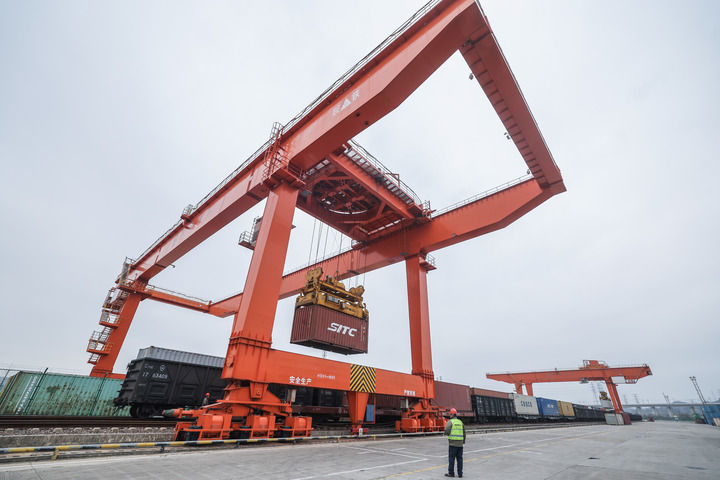 2026年1月30日,在義烏鐵路口岸,一列載著進(jìn)口商品的中歐班列回程班列在卸貨。