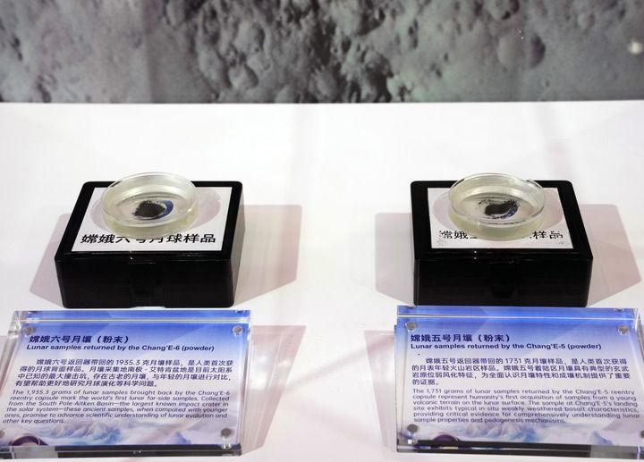 2025年11月5日在第八屆進(jìn)博會(huì)國家展中國館拍攝的“嫦娥五號”月壤和“嫦娥六號”月壤。