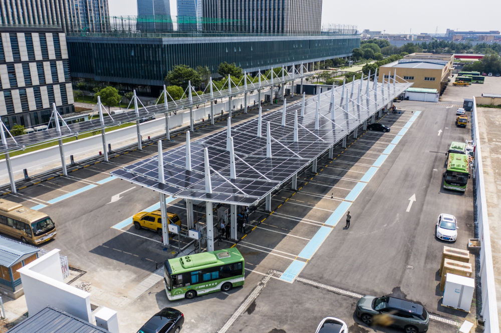 2025年5月27日拍攝的浙江省湖州市長(zhǎng)興公交總站光儲(chǔ)充一體化公交充電站(無人機(jī)照片)。新華社記者 徐昱 攝
