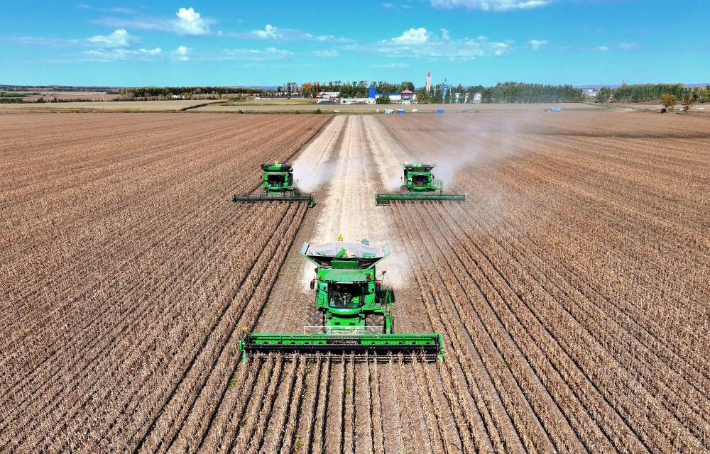 2025年9月29日,在北大荒集團(tuán)黑龍江尾山農(nóng)場(chǎng)有限公司第一管理區(qū),農(nóng)機(jī)進(jìn)行大豆收獲作業(yè)(無人機(jī)照片)。新華社發(fā)(陸文祥攝)