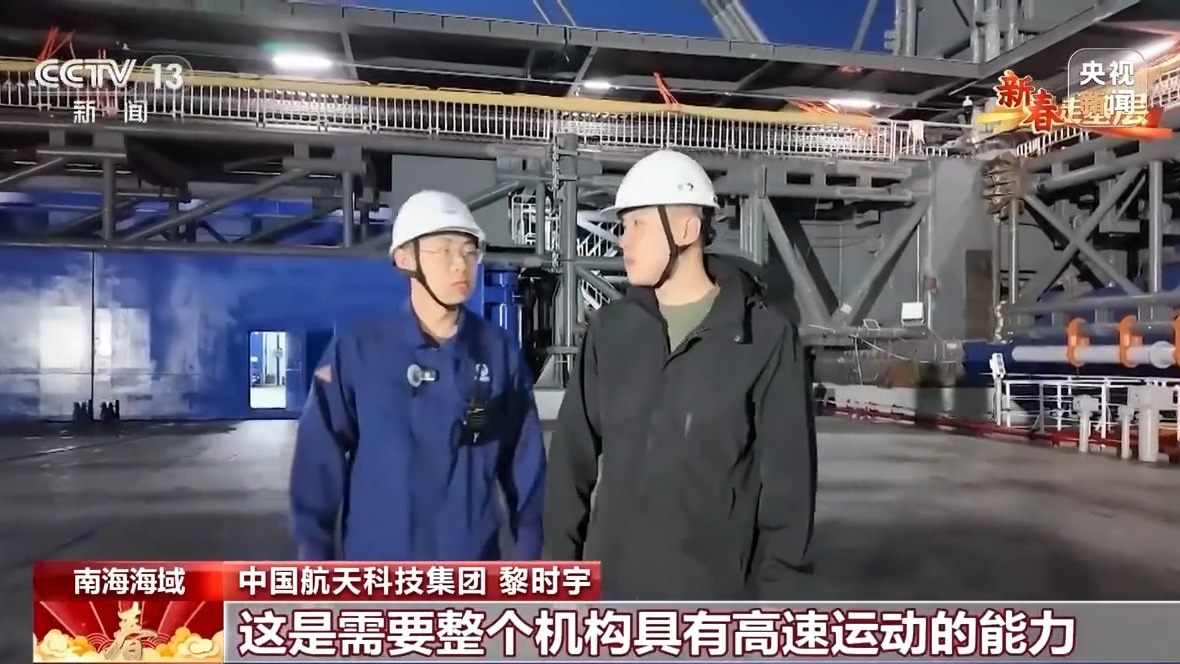 總臺記者 馬宇辰:“領(lǐng)航者”號海上回收平臺長144米,寬50米,滿載排水量超過2.5萬噸,是個名副其實的大家伙。但是發(fā)射塔架的高度接近70米,加上船體和天線,整體的高度接近30層樓高,所以它的重心是非常高的,再加上冬天的海況比較惡劣,我的感覺就是整個船體都在不規(guī)律地搖晃著。