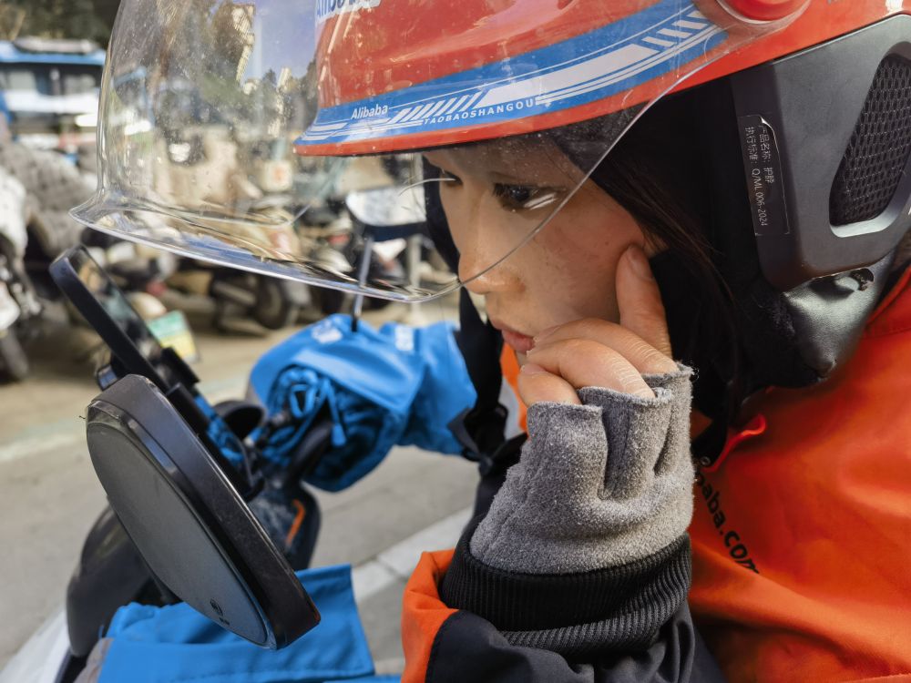 外賣(mài)騎手朱亭亭在查看雨雪天氣送餐時(shí)臉上摔出的傷。新華社記者 朱青 攝