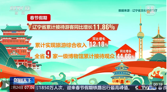 記者從遼寧省文化和旅游廳了解到,春節(jié)假期期間遼寧省累計接待游客同比增長11.86%,累計實現(xiàn)旅游綜合收入同比增長12.18%。全省9家一級博物館累計接待觀眾同比增長44.66%。