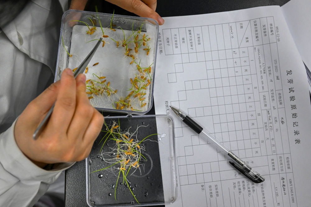 2022年3月23日,在湖南省農(nóng)作物種質(zhì)資源庫實驗室,檢測員對保存的水稻種子進(jìn)行發(fā)芽試驗檢測。