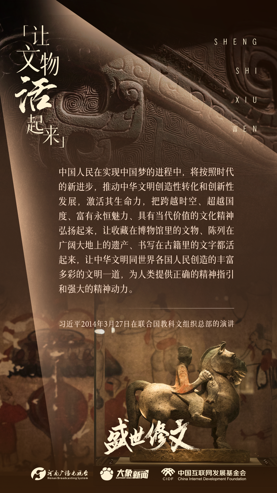 河南廣播電視臺大象新聞大型融媒體報道《盛世修文》,深入闡釋習(xí)近平文化思想,著力推進(jìn)黨的創(chuàng)新理論飛入尋常百姓家。