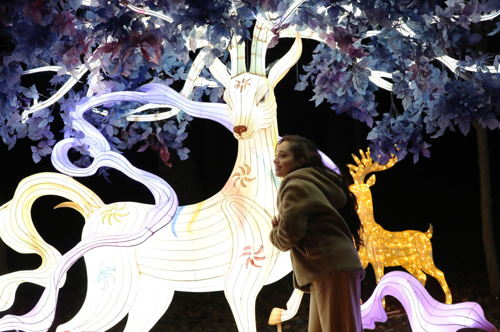 2023年12月14日,一名女子在法國(guó)巴黎風(fēng)情園舉辦的“山海有靈”法國(guó)豫園燈會(huì)上拍照留念。新華社記者 高靜 攝