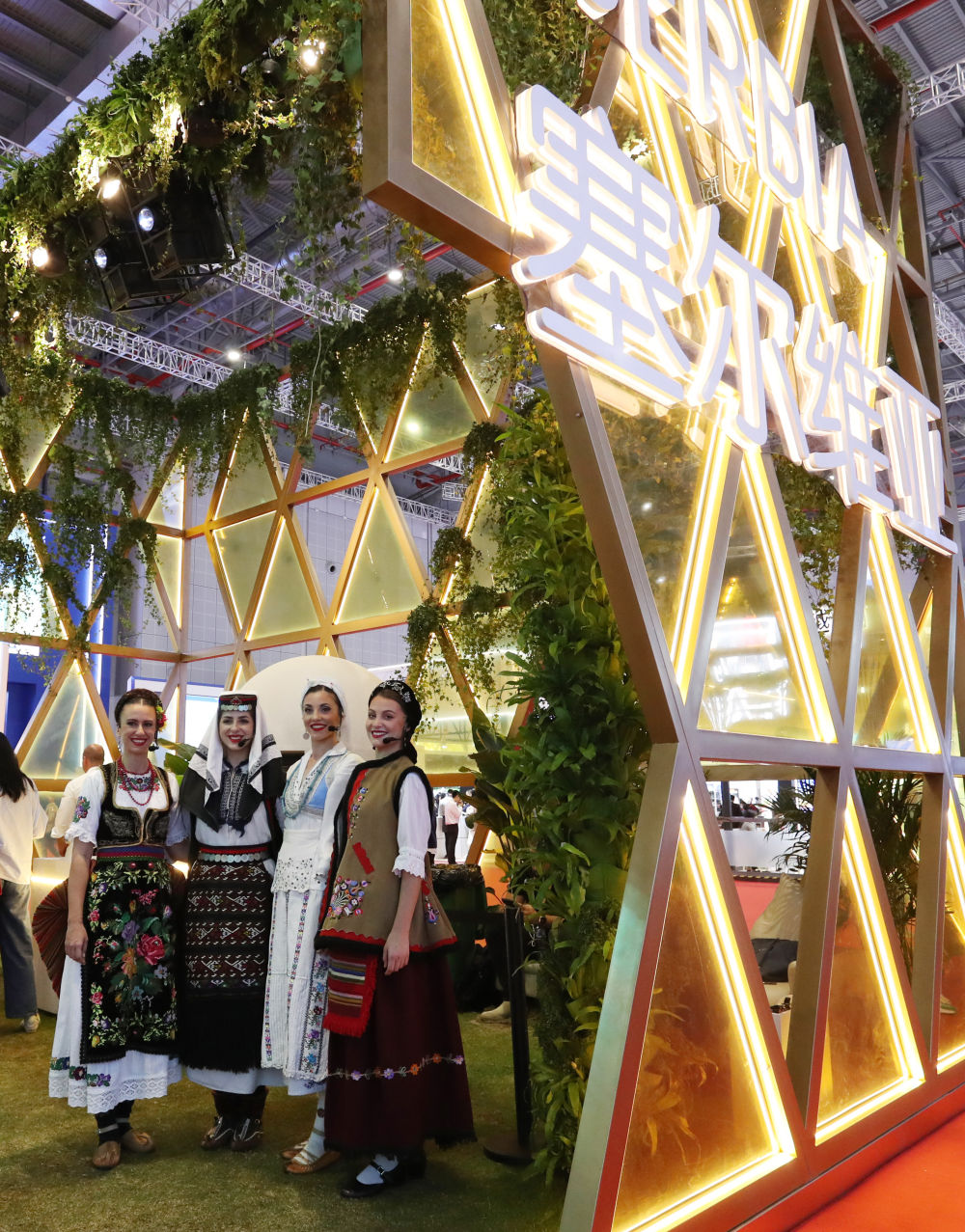 2023年11月6日,身著傳統(tǒng)服飾的演職人員在上海進(jìn)博會(huì)國(guó)家展塞爾維亞展臺(tái)迎接參觀者。第六屆進(jìn)博會(huì)國(guó)家展全面恢復(fù)線下舉辦,洪都拉斯、塞爾維亞、越南、南非、哈薩克斯坦作為本屆進(jìn)博會(huì)主賓國(guó)在國(guó)家展亮相。新華社記者 方喆 攝