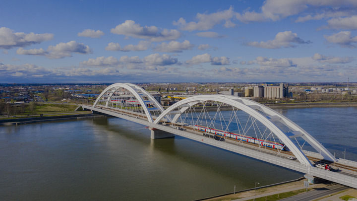 △2024年3月12日,一列火車運行在匈塞鐵路塞爾維亞境內(nèi)貝諾段諾維薩德多瑙河大橋上。