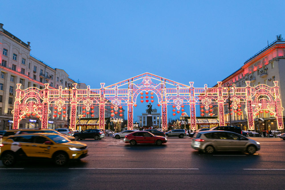 2024年2月9日,在俄羅斯首都莫斯科,車輛在中國新年主題裝飾前駛過。當日,“莫斯科的中國新年”文化活動在俄羅斯首都莫斯科市中心啟動?! ⌒氯A社記者 白雪騏 攝