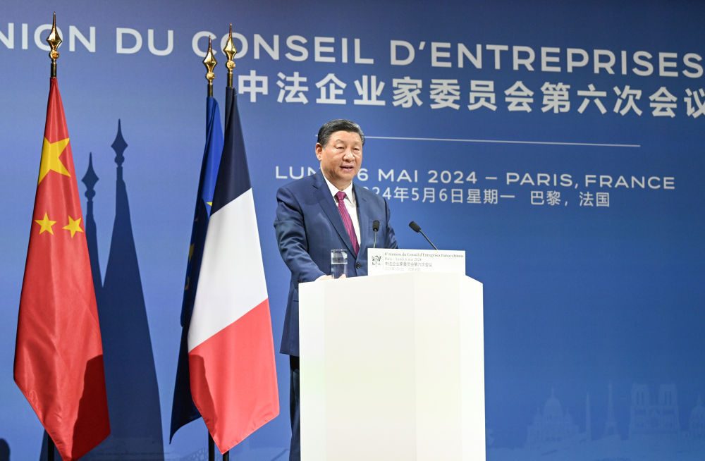 當(dāng)?shù)貢r間5月6日下午,國家主席習(xí)近平在巴黎同法國總統(tǒng)馬克龍共同出席中法企業(yè)家委員會第六次會議閉幕式,并發(fā)表題為《繼往開來,攜手開創(chuàng)中法合作新時代》的重要致辭。兩國元首同中法企業(yè)家代表合影,隨后共同步入劇院禮堂。