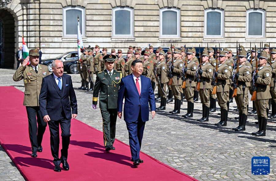 當(dāng)?shù)貢r間5月9日上午,國家主席習(xí)近平在布達(dá)佩斯出席匈牙利總統(tǒng)舒尤克和總理歐爾班共同舉行的隆重歡迎儀式。這是習(xí)近平在舒尤克陪同下檢閱儀仗隊(duì)。新華社記者 殷博古 攝