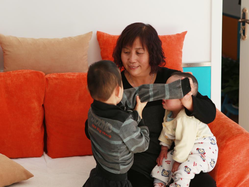 2017年11月3日,內(nèi)蒙古呼和浩特市兒童福利院里,“愛心媽媽”景鳳英抱著兩個(gè)孩子。新華社記者 王婧嬙 攝