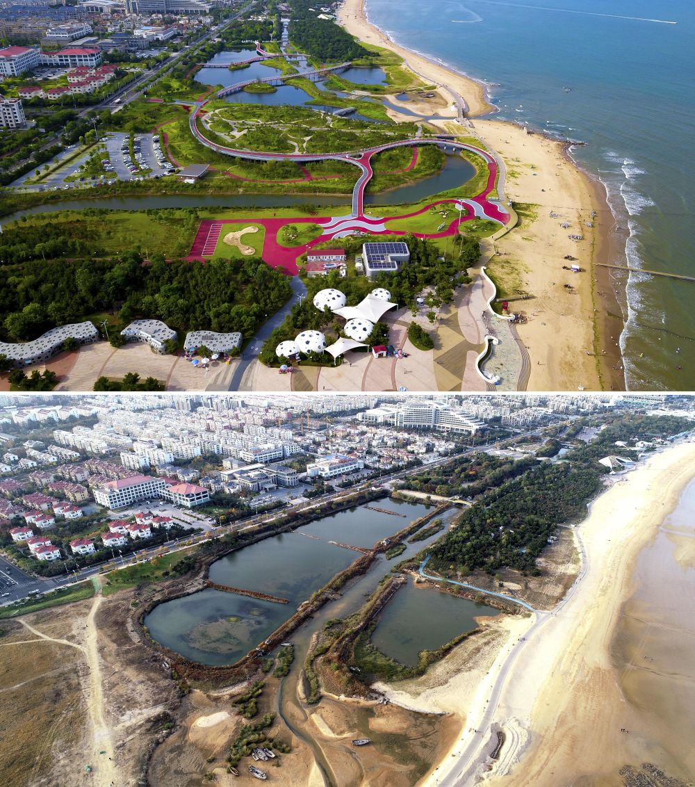 這是一張拼版照片,上圖為2021年拍攝的生態(tài)修復(fù)完成后的山東日照市陽光海岸綠道,該綠道長28公里(無人機照片);下圖為2019年11月拍攝的日照市陽光海岸綠道未經(jīng)生態(tài)修復(fù)時的樣子。新華社記者 郭緒雷 攝