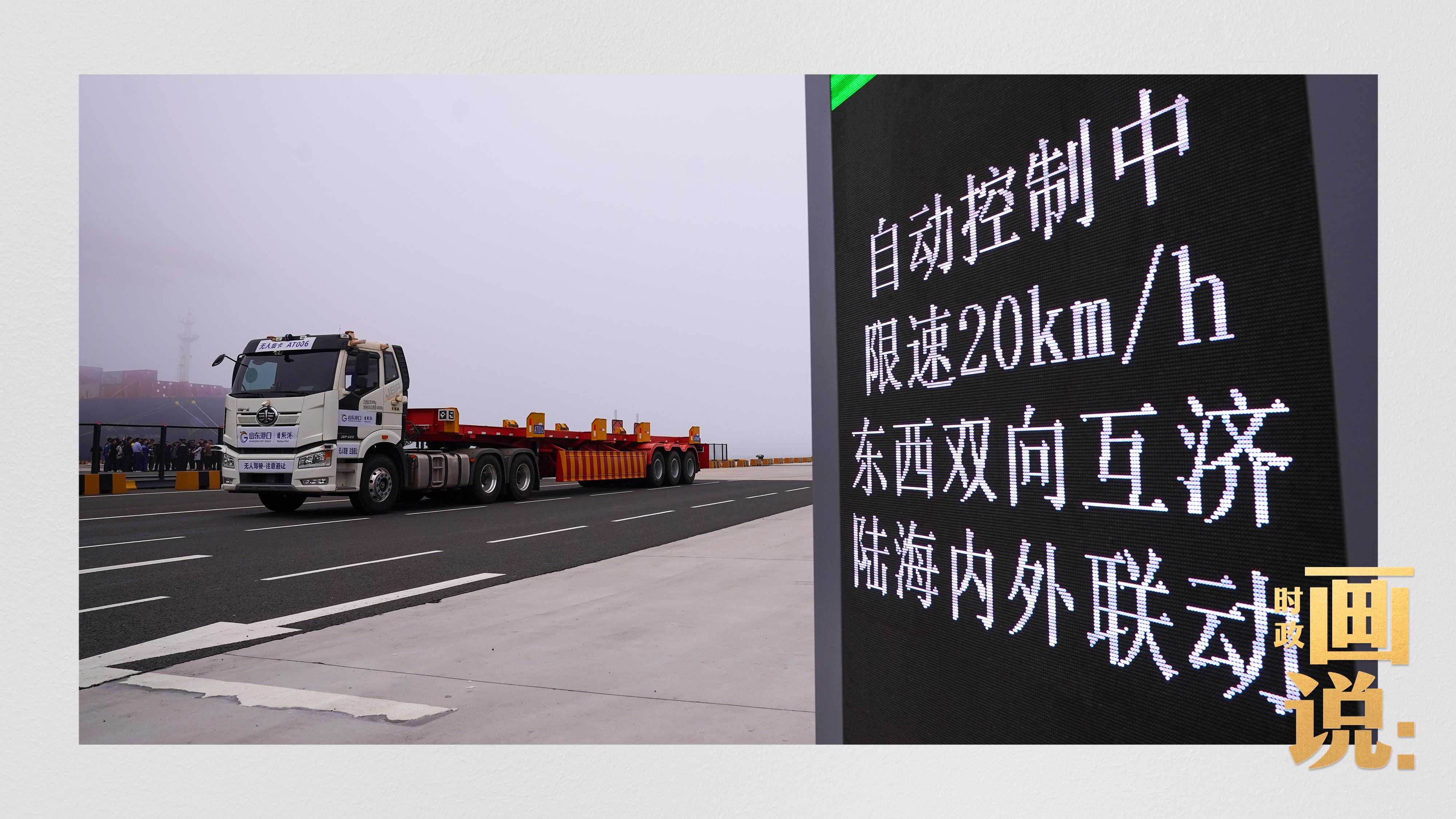 山東港口集團(tuán)日照港順岸開放式全自動(dòng)化集裝箱碼頭,無人集卡車在運(yùn)送集裝箱。