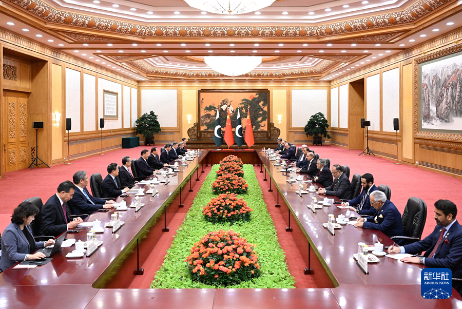 6月7日下午,國家主席習(xí)近平在北京人民大會堂會見來華正式訪問的巴基斯坦總理夏巴茲。新華社記者 黃敬文 攝