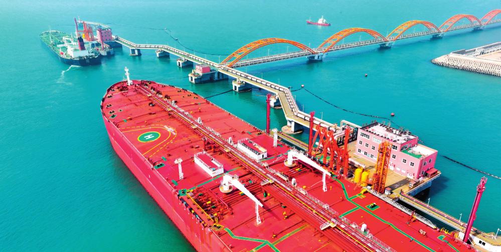 在山東港口日照港嵐山港區(qū)30 萬噸級油品碼頭,船舶??窟M行卸油作業(yè)(2024年3月29日攝)郭緒雷攝 / 本刊