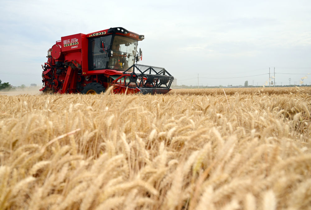 2024年5月29日,在太和縣淙祥現(xiàn)代農(nóng)業(yè)種植專業(yè)合作社,農(nóng)機(jī)手操作機(jī)械設(shè)備收割小麥。