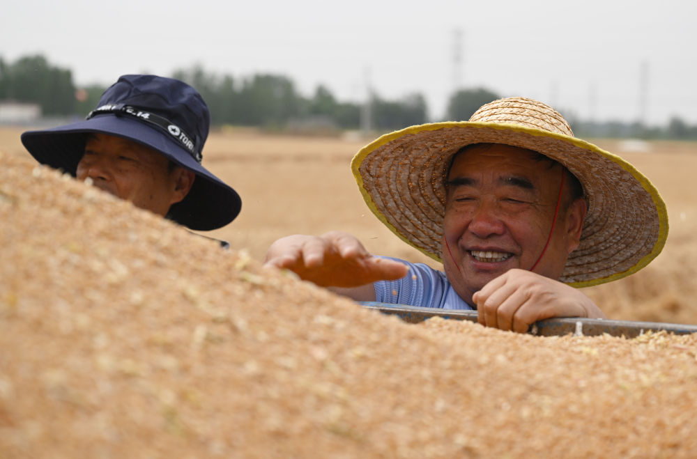 2024年5月29日,在太和縣淙祥現(xiàn)代農(nóng)業(yè)種植專業(yè)合作社,徐淙祥察看收獲的小麥。