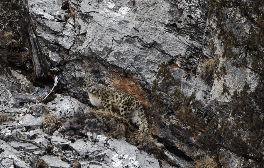 2023年2月21日,在青海省玉樹(shù)藏族自治州雜多縣昂賽鄉(xiāng)境內(nèi)的昂賽大峽谷內(nèi),一只雪豹準(zhǔn)備向上攀爬。新華社記者 費(fèi)茂華 攝