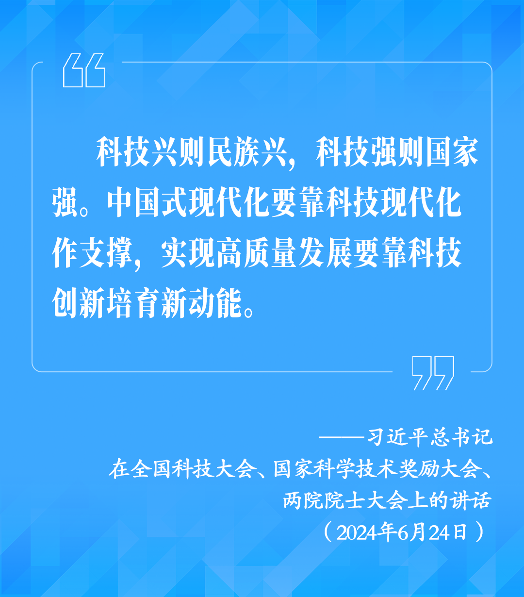 6月24日,全國科技大會、國家科學技術獎勵大會、兩院院士大會在北京召開,習近平總書記為國家最高科學技術獎獲得者等頒獎并發(fā)表重要講話。總書記強調,科技興則民族興,科技強則國家強。中國式現(xiàn)代化要靠科技現(xiàn)代化作支撐,實現(xiàn)高質量發(fā)展要靠科技創(chuàng)新培育新動能。