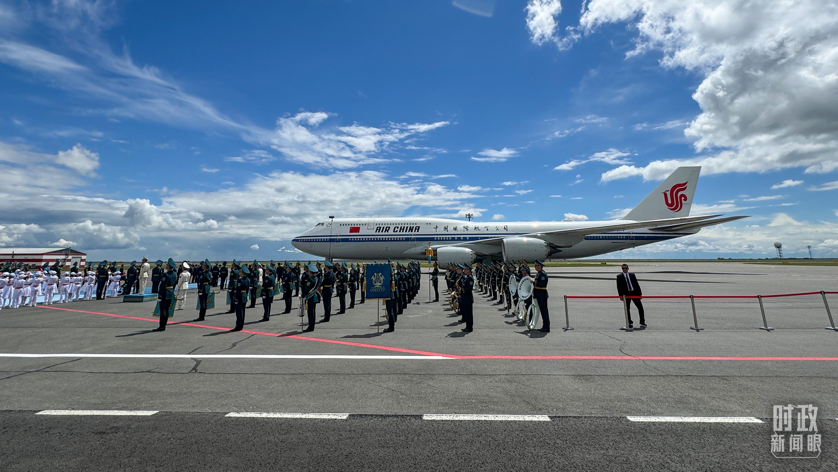習主席乘專機抵達阿斯塔納。(總臺央視記者郁振一拍攝)