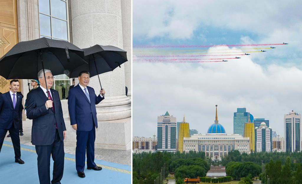 當(dāng)?shù)貢r(shí)間7月3日,國(guó)家主席習(xí)近平在阿斯塔納出席哈薩克斯坦總統(tǒng)托卡耶夫舉行的歡迎儀式。習(xí)近平乘車抵達(dá)總統(tǒng)府時(shí),托卡耶夫總統(tǒng)熱情迎接。六架哈薩克斯坦空軍戰(zhàn)機(jī)從總統(tǒng)府上空飛過,拉出象征中國(guó)國(guó)旗的紅黃色彩煙,以最高禮儀歡迎習(xí)近平對(duì)哈薩克斯坦進(jìn)行國(guó)事訪問。