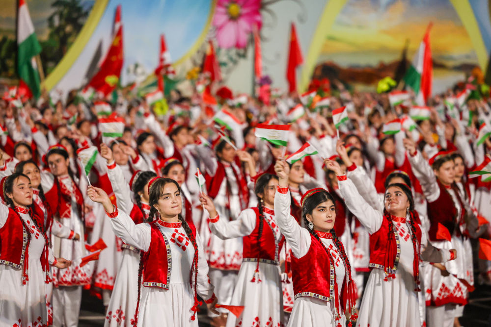 1500多名身著民族盛裝的塔吉克斯坦青年表演富有濃郁特色的中塔歌舞,揮舞中塔兩國國旗,表達對中國最尊貴客人的熱烈歡迎。