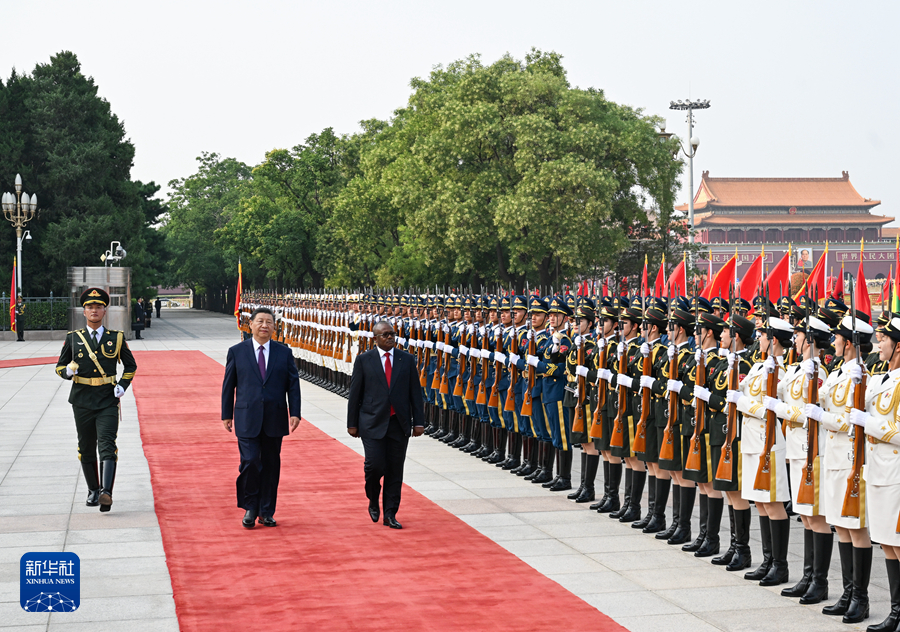 恩巴洛抵達(dá)時,禮兵列隊致敬。兩國元首登上檢閱臺,軍樂團奏中國和幾內(nèi)亞比紹兩國國歌,天安門廣場鳴放21響禮炮。恩巴洛在習(xí)近平陪同下檢閱中國人民解放軍儀仗隊,并觀看分列式。