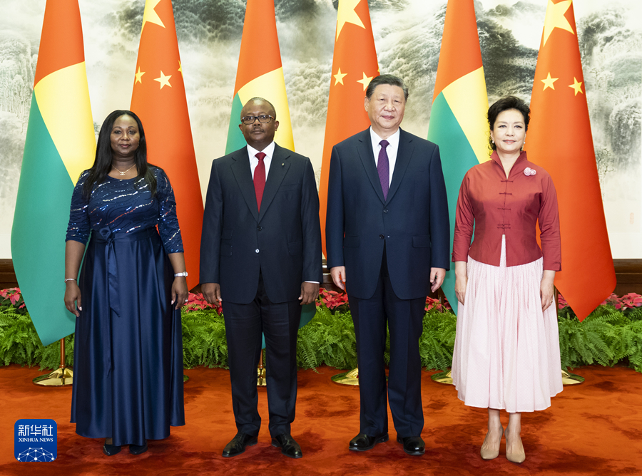 7月10日下午,國家主席習(xí)近平在北京人民大會堂同來華進(jìn)行國事訪問的幾內(nèi)亞比紹總統(tǒng)恩巴洛舉行會談。這是會談前,習(xí)近平和夫人彭麗媛同恩巴洛和夫人迪尼西婭合影。新華社記者 黃敬文 攝