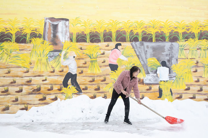 黑龍江省漠河市北極鎮(zhèn)北紅村“遠(yuǎn)方故里”民宿負(fù)責(zé)人張翠花在清理積雪(2023年1月12日攝)。