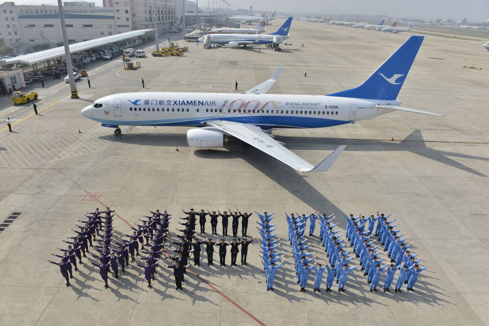 2013年11月16日,廈航機(jī)隊(duì)規(guī)模增至100架,這是廈航員工在機(jī)隊(duì)第100架飛機(jī)前擺出MF100字樣。新華社記者 項(xiàng)開來 攝