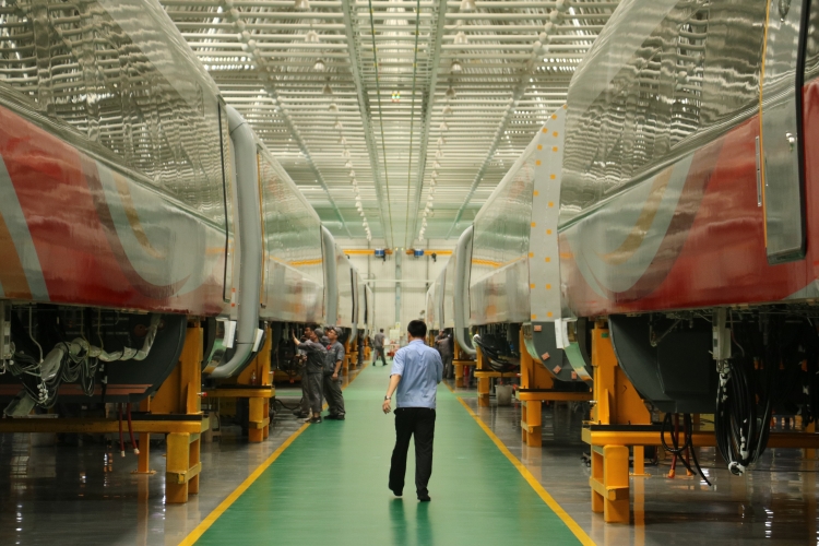中車長(zhǎng)客動(dòng)車組裝配產(chǎn)線。人民網(wǎng) 任佳暉 攝