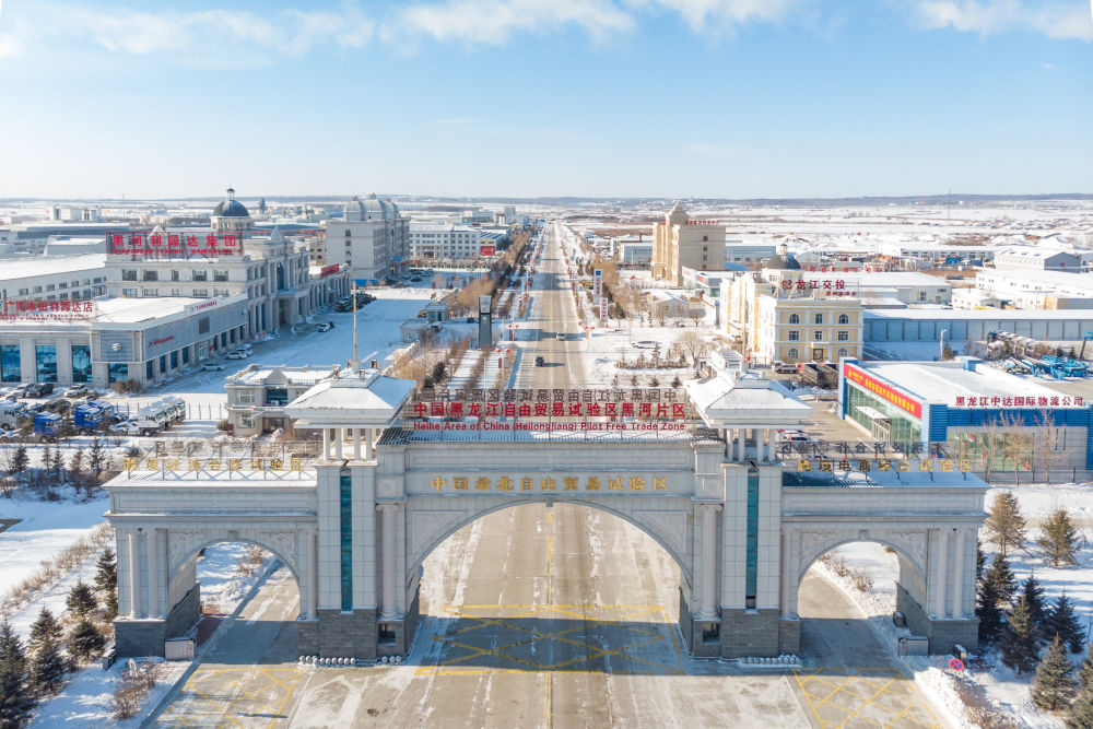 這是2024年1月31日拍攝的中國(guó)(黑龍江)自由貿(mào)易試驗(yàn)區(qū)黑河片區(qū)(無人機(jī)照片)。五年來,中國(guó)(黑龍江)自由貿(mào)易試驗(yàn)區(qū)將“試驗(yàn)田”種成“高產(chǎn)田”,以全省萬(wàn)分之三的面積,貢獻(xiàn)了全省約五分之一的實(shí)際使用外資和七分之一的外貿(mào)進(jìn)出口,在對(duì)外合作、降低物流成本、培育特色產(chǎn)業(yè)和新業(yè)態(tài)新模式等方面深入探索,成功產(chǎn)出超過300項(xiàng)制度創(chuàng)新成果。