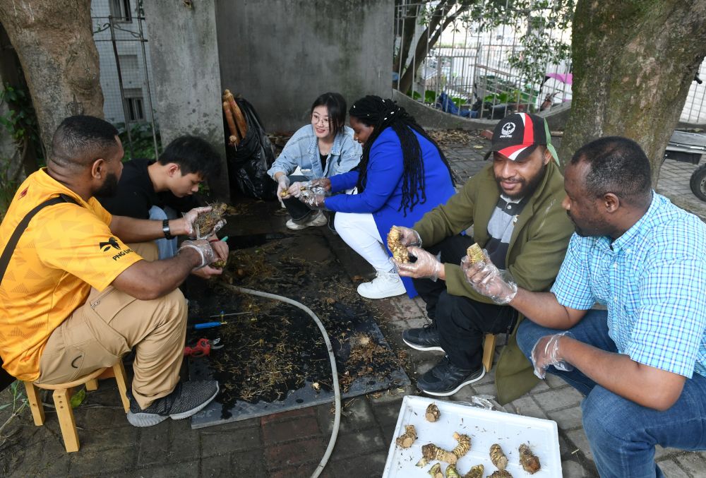 3月28日,在位于福州的福建農(nóng)林大學(xué),來(lái)自盧旺達(dá)和巴布亞新幾內(nèi)亞的學(xué)生與菌草專(zhuān)業(yè)學(xué)生交流。新華社記者 林善傳 攝