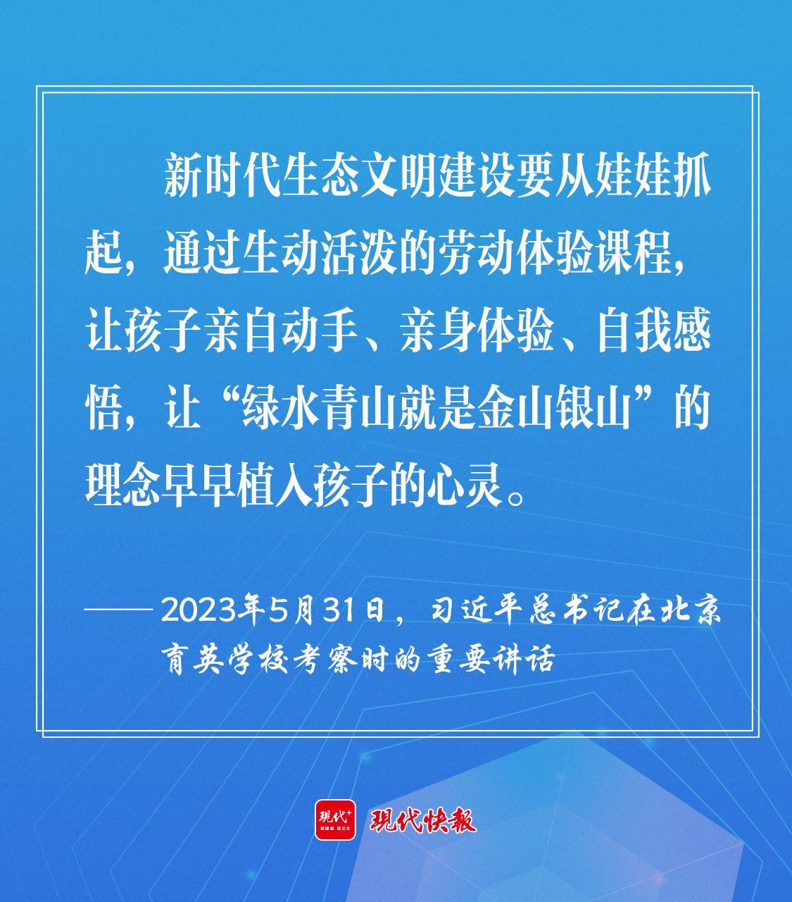 2023年5月,習(xí)近平總書記在北京育英學(xué)校考察時強調(diào),新時代生態(tài)文明建設(shè)要從娃娃抓起,通過生動活潑的勞動體驗課程,讓孩子親自動手、親身體驗、自我感悟,讓“綠水青山就是金山銀山”的理念早早植入孩子的心靈。