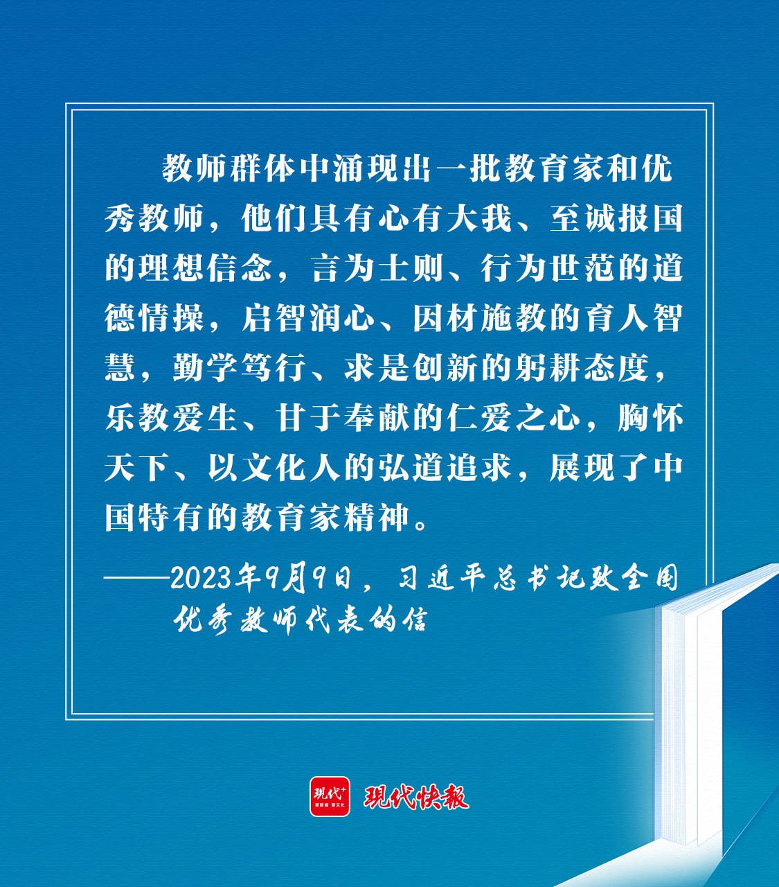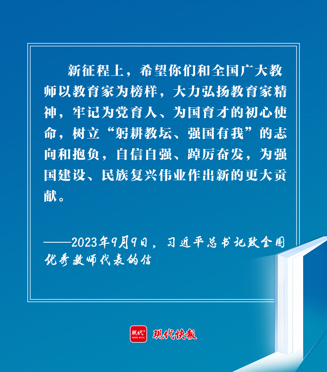 2023年9月9日,習(xí)近平總書記在致全國優(yōu)秀教師代表的信中強(qiáng)調(diào):“新征程上,希望你們和全國廣大教師以教育家為榜樣,大力弘揚(yáng)教育家精神,牢記為黨育人、為國育才的初心使命,樹立‘躬耕教壇、強(qiáng)國有我’的志向和抱負(fù),自信自強(qiáng)、踔厲奮發(fā),為強(qiáng)國建設(shè)、民族復(fù)興偉業(yè)作出新的更大貢獻(xiàn)。”