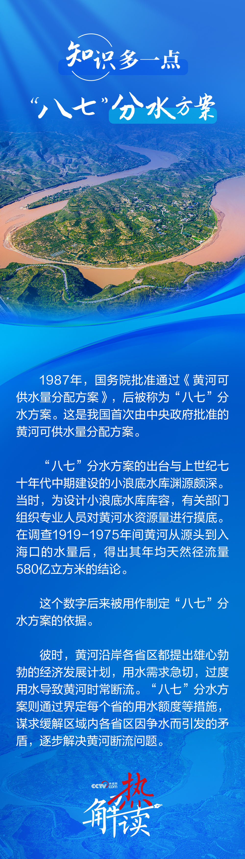 “八七”分水方案是上世紀(jì)八十年代我國(guó)批準(zhǔn)的黃河可供水量分配方案。該方案以1980年實(shí)際用水量為基準(zhǔn),綜合考慮了沿黃各省區(qū)的灌溉發(fā)展規(guī)模、工業(yè)和城市用水增長(zhǎng)以及大中型水利工程興建等因素,來(lái)為沿黃各省區(qū)分配黃河用水權(quán)。“八七”分水方案自1987年國(guó)務(wù)院批復(fù)后沿用至今,未重新調(diào)整。